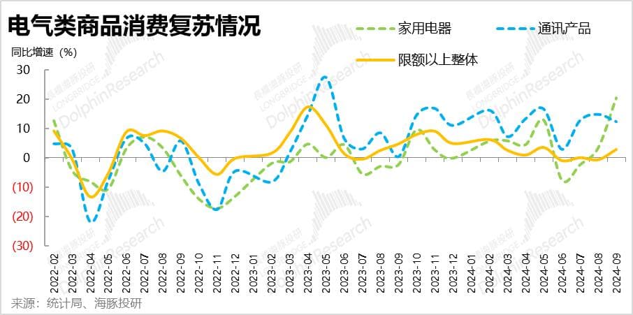 具体来看,主要是通电类产品的收入从上季的同比下滑4.6%,回暖到了正增2.7%,国补的拉动有明显体现,但同样市场对此也已有预期,实际表现仅比预期稍高0.8%。从NBS公布的整体零售数据,家电类销售增速从6、7月的负增,快速拉升到9月同比超20%的增速,可见确实有明显的改善趋势。可以期待4季度通电产品的增长会不会有惊喜。