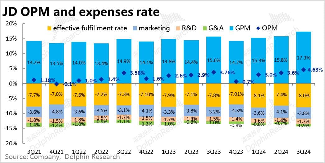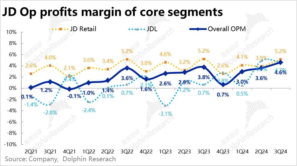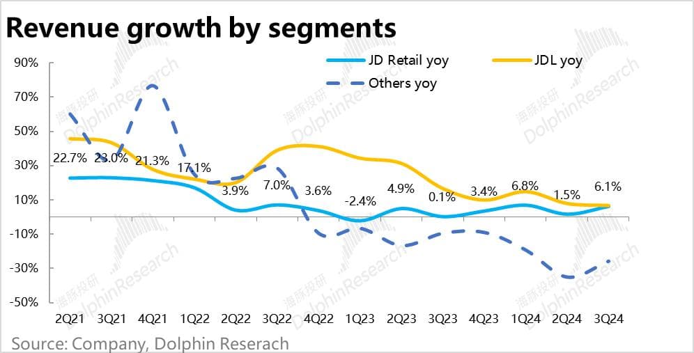 3、物流与其他服务:包括京东物流、达达快送的物流板块本季收入增速略微放缓到7%,稍低于市场预期1.1pct。近期京东物流官方接入淘天平台有望助力物流业务的增长,但在3Q期间尚无多少体现。不过虽然物流板块增长放缓,利润释放却非常惊人,后文详谈。
