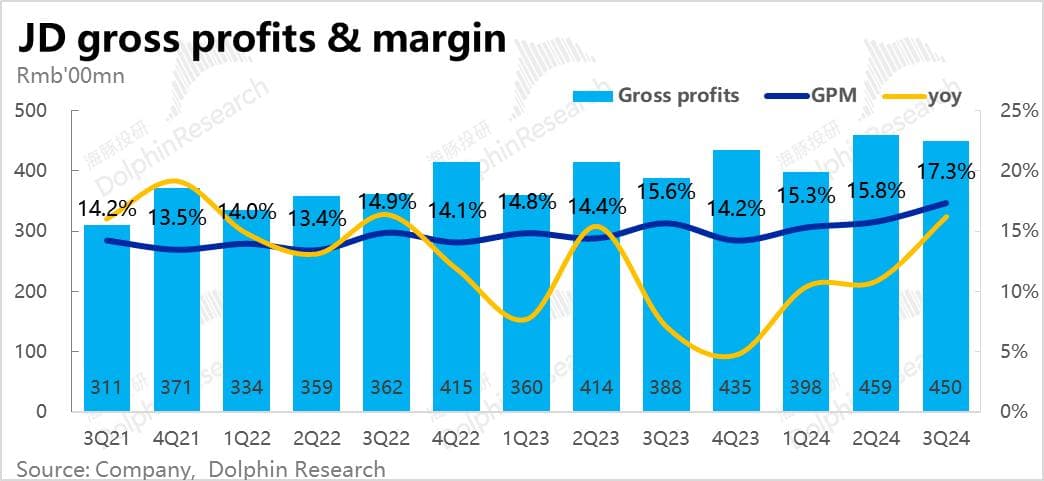 3、包括京东物流、达达快送的物流性收入本季增速从约8%放缓到6.5%,实际收入比预期稍低约1.4%。近期京东物流接入淘天平台有望助力物流业务的增长,但在3Q期间尚无多少体现。不过,物流板块虽然增长稍显强差人意,利润释放却非常惊人。