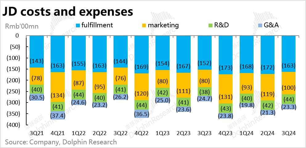 7、费用层面,营销支出本季明显增长到100亿(vs.去年同期的80亿),高出预期的91亿。类似的,研发支出也由去年的38亿增长到44亿,也高出预期的40亿。可见本季度的费用支出有明显的增长且高出预期。由此推断京东在3Q应当实打实地有增加补贴或者获客的投入力度,这应当是商城板块利润率不升反微降的主要原因。