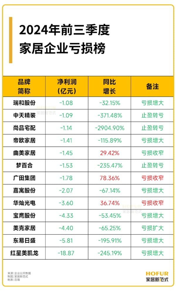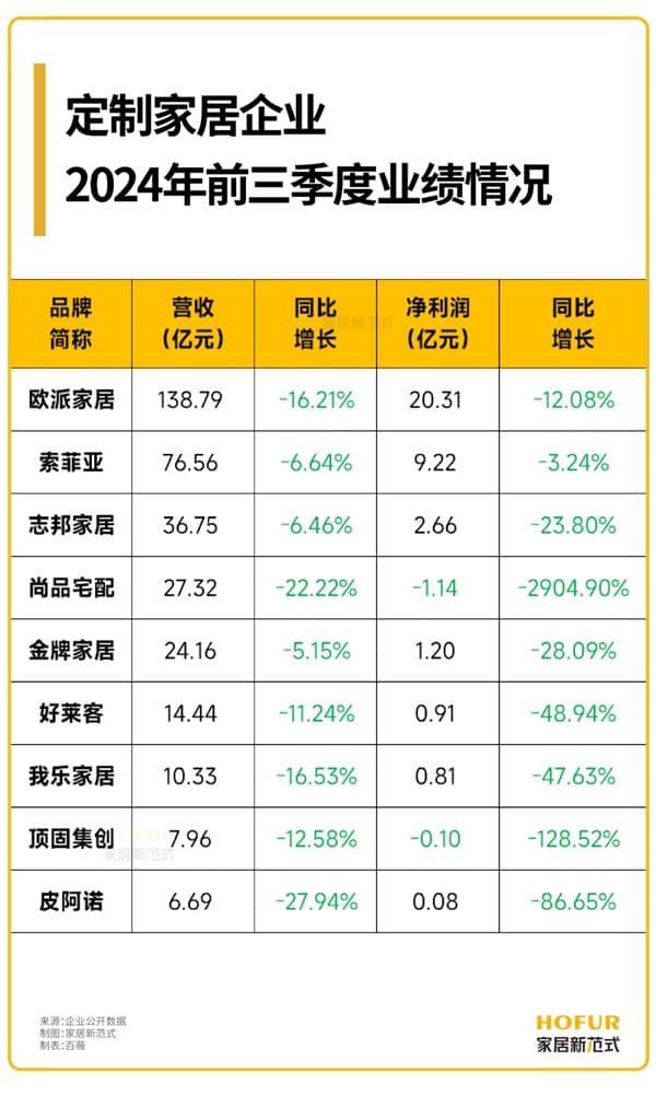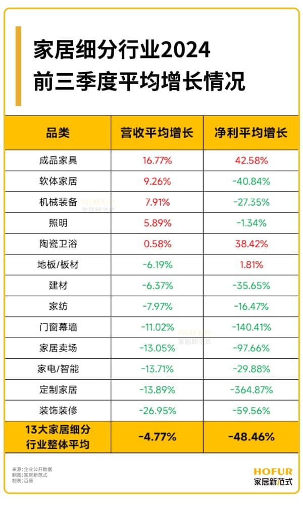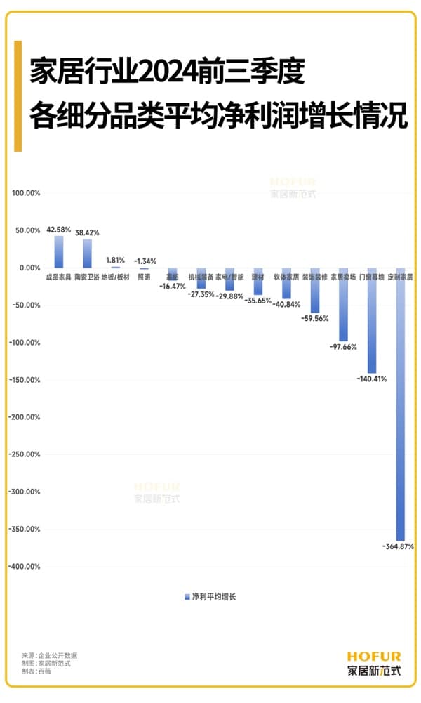 有人欢喜有人愁。昔日曾一度辉煌的定制家居、装饰装修、家居卖场、门窗幕墙四大赛道,如今无论是营收还是净利都增幅垫底。特别是定制家居和装饰装修行业令人唏嘘,平均净利、平均营收降幅分别低至-364.87%和-26.96%,为“下滑之最”。