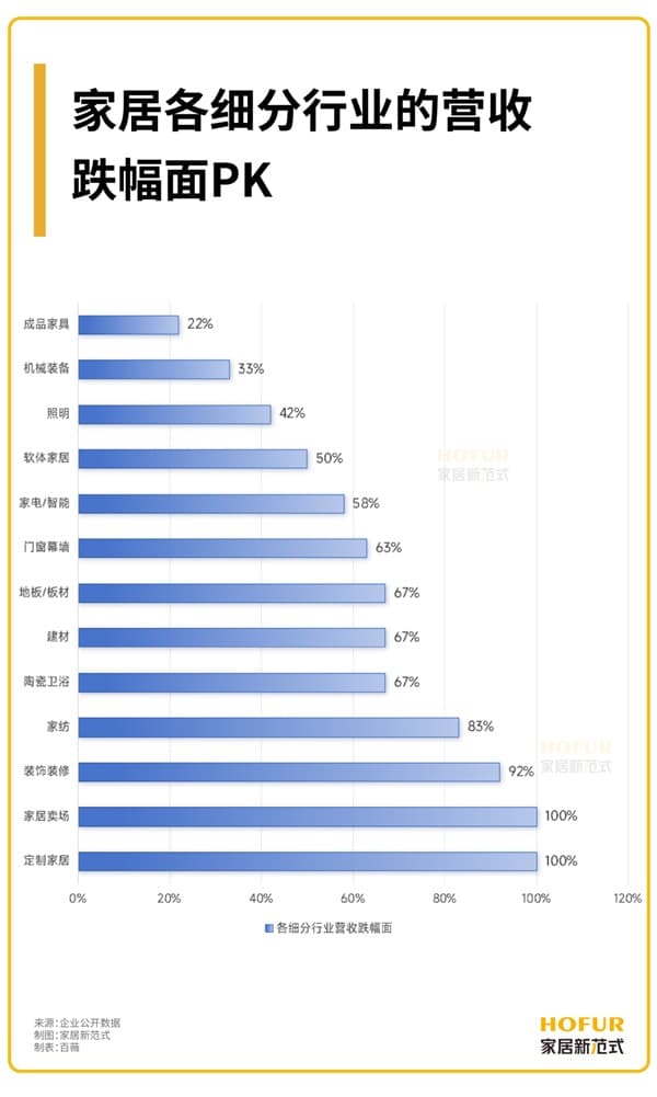 各行业的营业收入平均降幅为-4.77%,净利润平均降幅为-48.46%,出现历史上罕见的双双增幅下滑局面;大家居行业的营收下滑面、净利下滑面、亏损面分别达64%、66%、23%;定制家居、卖场、装饰装修、门窗幕墙四大行业令人唏嘘;受益出口市场的成品家具行业成唯一亮眼的业绩新星……