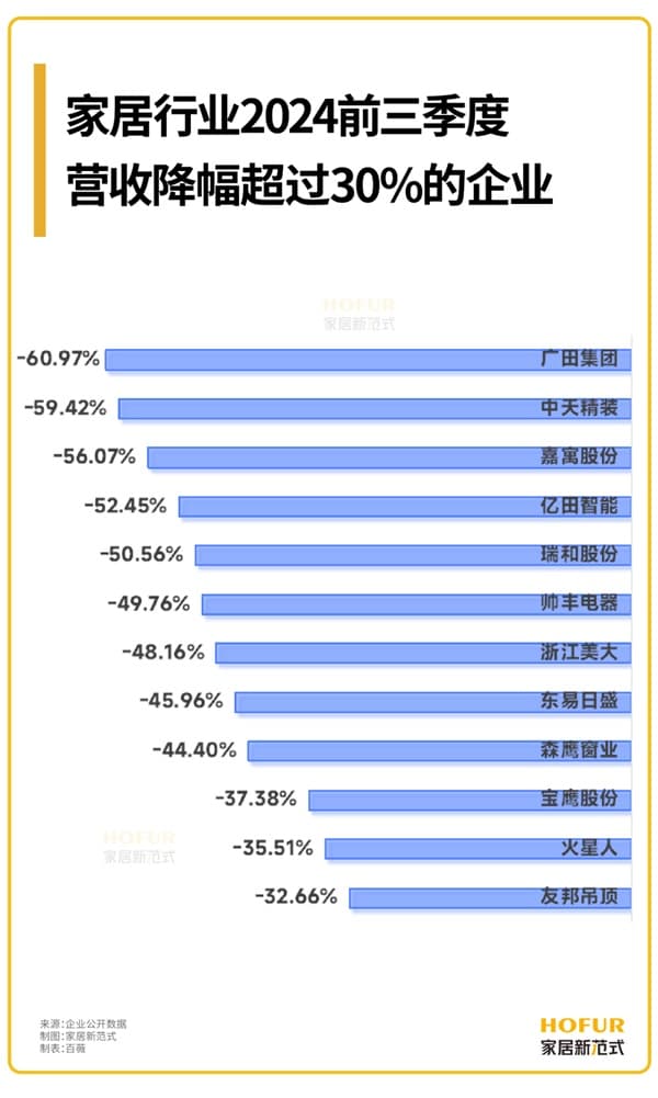 具体来看,定制家居行业的9大上市公司、家居卖场行业的3大上市公司,全部出现营收、净利双双下滑的“全绿”境况,无一幸免。平均营收降幅超过30%的唯12家企业里,有5家来自装饰装修行业,分别是广田集团、中天精装、瑞和股份、东易日盛、宝鹰股份。