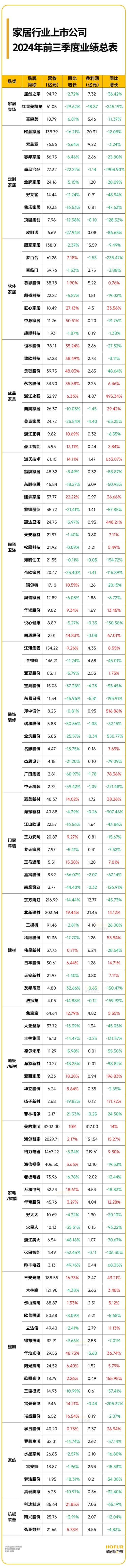 以下奉上115家家居行业上市公司2024年前三季度的业绩总表供查阅: