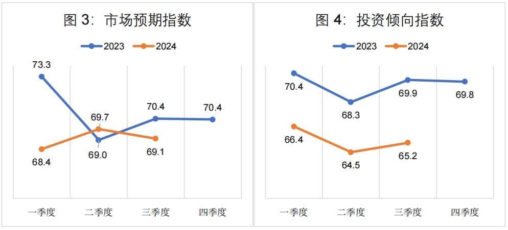 样本企业对未来市场预期略有下降,但未影响投资倾向的边际提升。2024年三季度,样本企业市场预期指数为69.1,较上季度环比略降0.6,与去年同期相比下降1.3,处于近两年来的较低水平(图 3)。投资倾向指数为65.2,较上季度环比略升0.7,与去年同期相比下降4.7(图4)。结束连续三个季度下滑的趋势,但投资倾向整体仍处于较低水平。