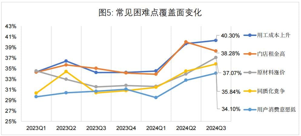 常见经营困难点覆盖面继续扩大。2024 年三季度,最常见的经营困难点依次为“用工成本上升”、“门店租金高”和“原材料涨价”,覆盖面分别为40.3%、38.3%和37.1%,环比分别上升0.6、下降1.7、上升3.1个百分点;同比分别上升6.1、3.3、5.6个百分点(图5)。其他困难点如“原材料涨价”、“用户消费意愿低”、“营销费用高”、“仓储物流成本高”等也出现覆盖面环比、同比同时上升的情况。总体来看,除“门店租金高”外,样本企业感受到的经营困难点延续了上季度持续扩大的情况,需要引起注意。