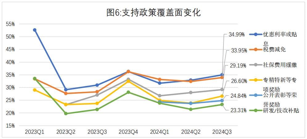 与之对应的是, 2024年三季度没有收到优惠政策支持的企业占样本企业总数的17.2%,较上季度环比降低1.5个百分点,与去年同期相比,大幅降低 5.5 个百分点,说明整体优惠政策支持的覆盖面有所扩大(图 7)。