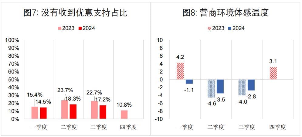营商环境“体感温度”仍处于偏冷区间。我们将经营困难点和支持政策覆盖面组合起来,编制了样本营商环境的“体感温度”指数。指数取值范围在[-100, 100]之间,困难越少、政策支持越多,则温度越高、营商环境越友好,反之亦然。2024年三季度,“体感温度”指数为-2.8,较二季度的-3.5提升0.7度(图8)。虽然经营困难点覆盖面有所扩大,但政策支持力度同步增强,“体感温度”有所提升,但仍处于偏冷区间。
