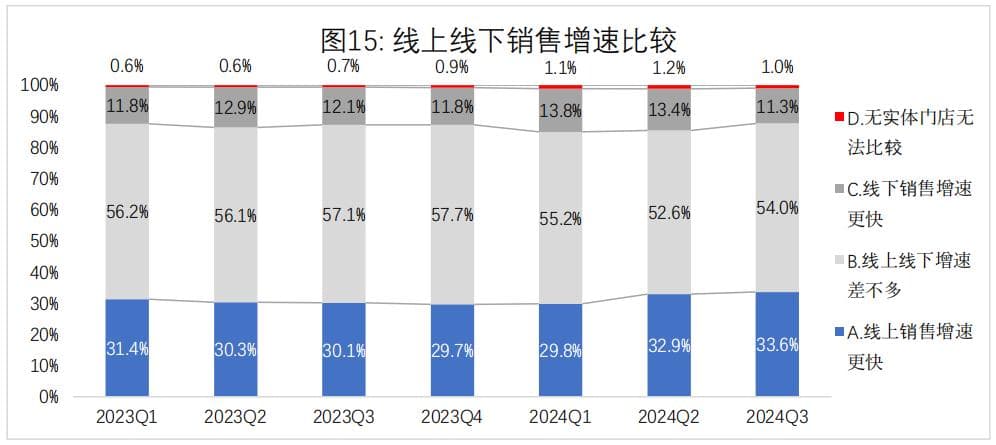 线上化率维持高位但连续两个季度回调。2024年三季度,样本企业线上化率(有线上门店企业占样本总数比重)为68.1%,较上季度的69.5%继续回调1.4个百分点,较去年同期的76.5%下降了8.4个百分点。在已线上化的样本企业中,融合型(超过30%的销售额来自线上)企业占比为22.8%,相比上季度的26.4%明显下降,减少了3.6个百分点,降至近五个季度的最低水平,显示线上销售的收入能力有所削弱(图13)。
