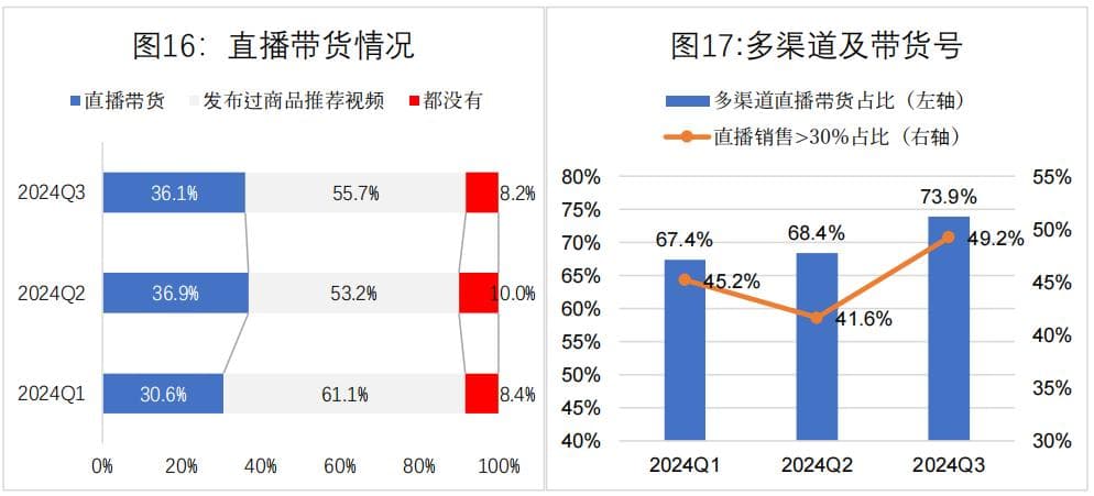 与线上经营跨平台相似的是,样本企业的直播带货也往往是通过多平台进行。2024年三季度,73.9%已进行过直播带货的样本企业在多个渠道进行了直播,较上季度的68.4%进一步提升了5.5个百分点。其中,在已进行过直播带货的样本企业中,带货号(超过30%的线上销售额来自直播带货)占比为49.2%,相比上季度的41.6%明显提升,增加了7.6个百分点(图17)。进一步说明直播带货正在成为线上销售收入的重要来源。