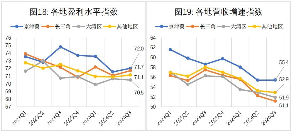 除京津冀外,各地样本企业营收增速均略有下降。2024年三季度,京津冀地区样本企业营收增速指数为 55.4,环比持平,较去年同期下降3.2。长三角和珠三角地区样本企业营收增速指数分别为51.1和51.9,较上季度分别下降1.1和1.0,较去年同期分别下降6.3和4.4。三季度全国其他地区样本企业营收增速指数为52.9,较上季度下降 0.4,较去年同期下降 5.2(图 19)。综合来看,除京津冀地区企业营收增速持平外,其他地区样本企业营收增速均有所放缓。