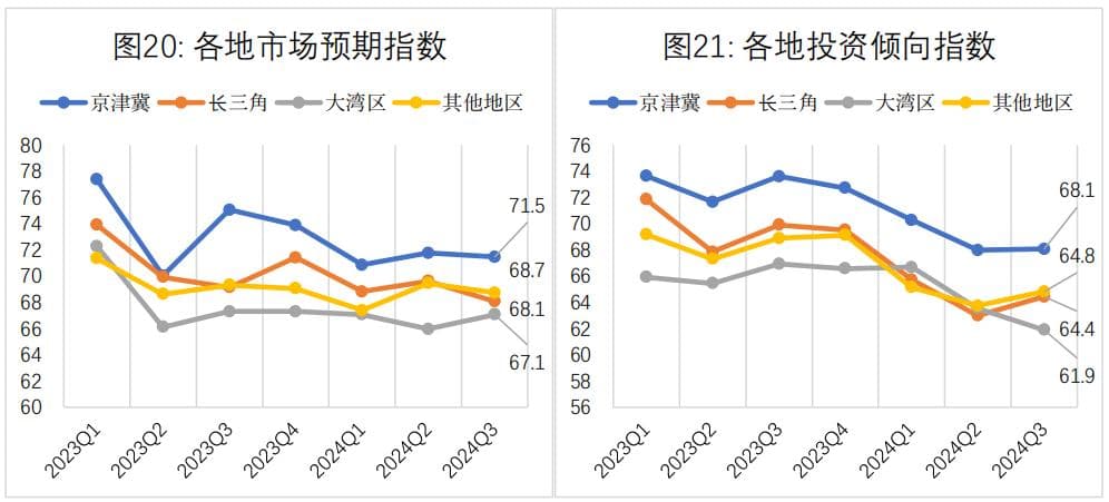 除大湾区外,各地样本企业未来市场预期均有所下降。2024年三季度,京津冀、长三角地区样本企业市场预期指数分别为 71.5 和 68.1,较上季度分别下降 0.3 和 1.5,较去年同期分别下降 3.6 和1.1。大湾区样本企业市场预期指数为 67.1,较上季度上升1.1,较去年同期微降 0.2。全国其他地区样本企业市场预期指数为 68.7,较上季度略降0.7,较去年同期略降0.6(图20)。综合来看,各地样本企业对外来市场预期大致稳定,大湾区样本企业预期边际改善,而其他地区企业的预期略降。