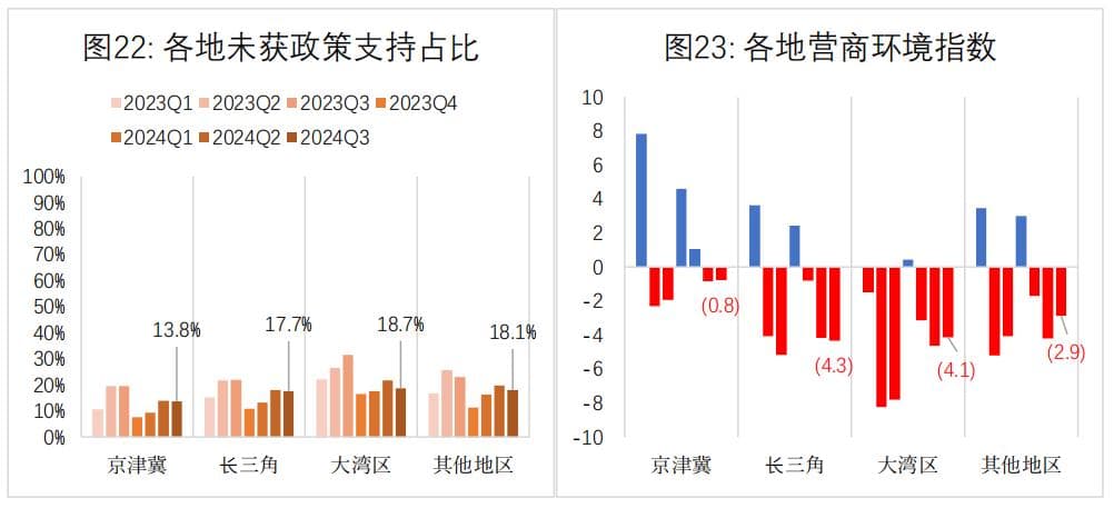 各地的政策支持覆盖面环比均有所扩大,也高于去年同期水平。2024年三季度京津冀、长三角、大湾区和全国其他地区未获政策支持样本企业占比分别为 13.8%、17.7%、18.7%和18.1%,较上季度分别下降了0.2、0.3、3.0 和1.6个百分点;较去年同期分别下降了5.9、4.2、12.8、4.9个百分点(图22)。未获政策支持企业环比、同比均有较大幅度的下降,说明政策覆盖面扩大,力度有所增强。