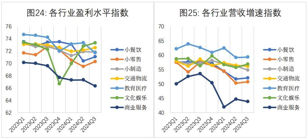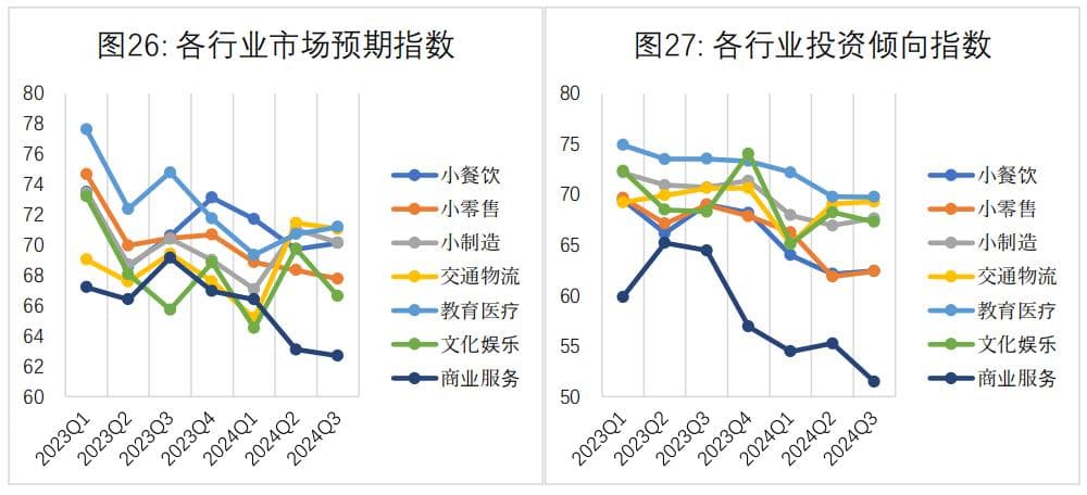 生产/加工/制造业(小制造)经营状况出现下滑。2024年三季度,“小零售”行业盈利水平指数为 71.8,环比微降0.1,同比下降 1.0;营收增速指数为54.8,环比下降1.4,同比下降2.4(图 24,25)。市场预期指数为 70.2,环比下降0.9,同比下降0.3;投资倾向指数为 67.7,环比上升0.7,同比下降3.1(图 26,27)。体感温度指数为-0.2,较上季度提升0.6度,高于去年同期的-2.5,接近冷热均衡线(图28)。
