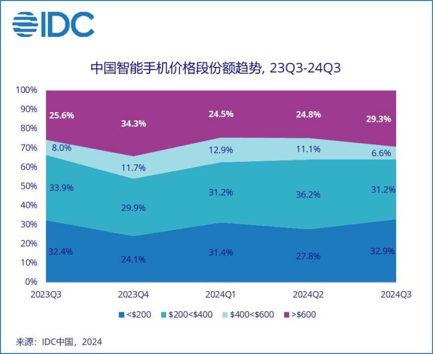 在中国,IDC的统计数据显示,今年第三季度,600美元以上的高端手机市场份额达到了29.3%,同比增长了3.7个百分点。这一增长不仅因为华为手机的强势回归,也反映了消费者愿意为更好的使用体验花更多钱。