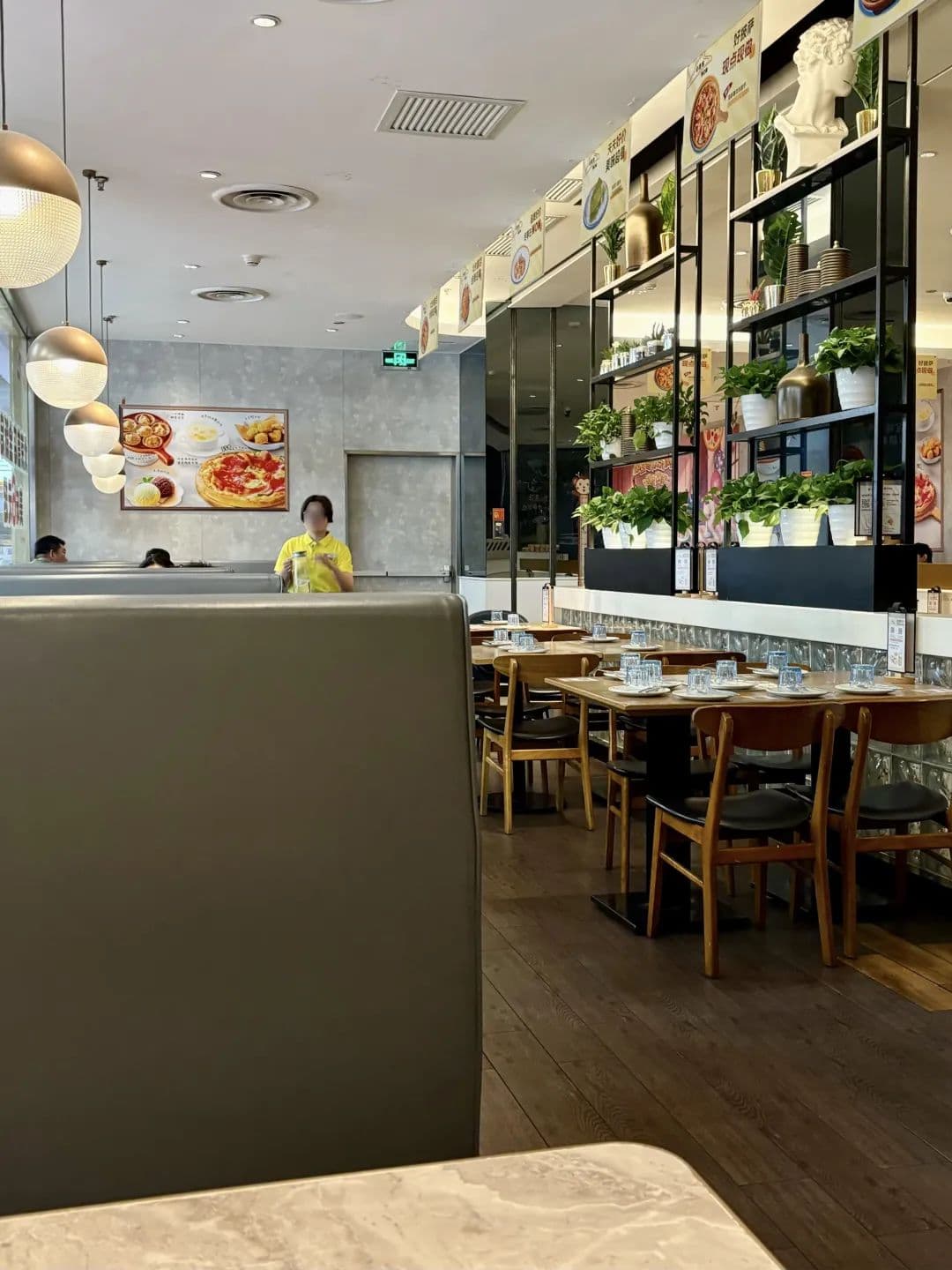 走进店内,环境与必胜客一样明亮且整洁。不同的是,四人大桌和红皮沙发式的家庭桌总体变少,两人小桌的密度明显变多。