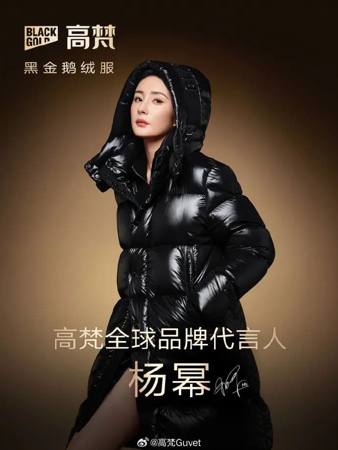 作为对标,去年高梵“承包”了GQ盛典的明星羽绒服穿搭,今年9月,高梵官宣杨幂作为品牌全球品牌代言人,此外还有马斯克妈妈、英国皇室成员等为高梵“站台”。
