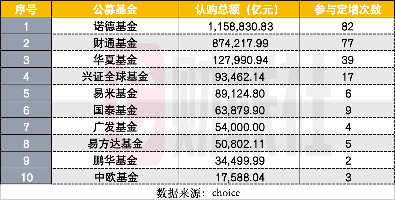 鹏华基金、中欧基金各自投入3.45亿元、1.76亿元,分别位列认购总额前十名,但未进入公募参与定增次数(家数)前十名;同时,西部利得、大成基金年内均参与4次定增,挤进了认购次数前十,但认购总额分别为1.08亿元、9800万元。