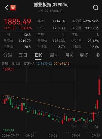 2024年9月,股市仿佛被打了羊胎素,突然从垂暮重返年轻。9月27日,上证指数飙升2.89%,逼近3100点;深证成指大涨6.71%,创下2009年3月以来最大单日涨幅;创业板指更是狂飙10%,刷新历史纪录。