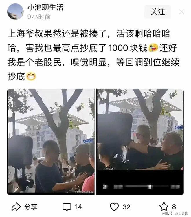 在频繁的回调和波动中,上海爷叔的处境也急转直下。昨日小甜甜,今日牛夫人,部分投资者因崇信爷叔的预测而遭受损失,网络上开始流传爷叔被愤怒的股民围攻了,甚至有网传视频他在马路股市沙龙被人爆踹。