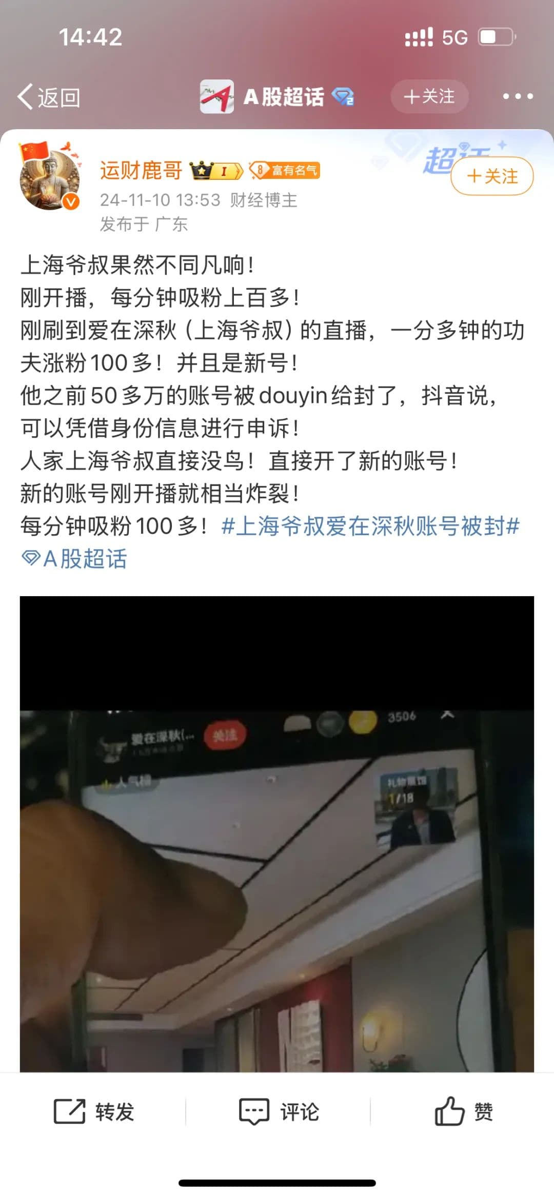 在10月30日,上海爷叔开设了抖音账号,粉丝暴涨,风光无两,荐股一哥,预定首播。