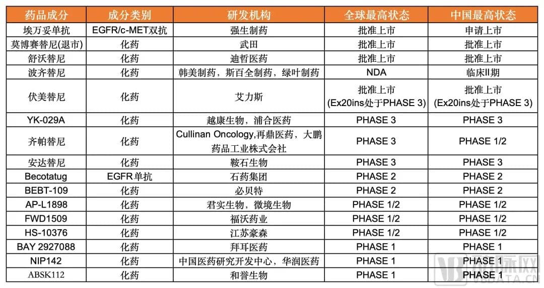 更重要的是,在这个赛道上目前全球仅两款EGFR exon20ins突变的NSCLC药物获批上市,分别是强生的埃万妥单抗和迪哲医药的舒沃替尼。其余产品管线,进度靠前的临床数据并不如舒沃替尼,而进度靠后的,在时间层面给舒沃替尼的商业化留足了时间。