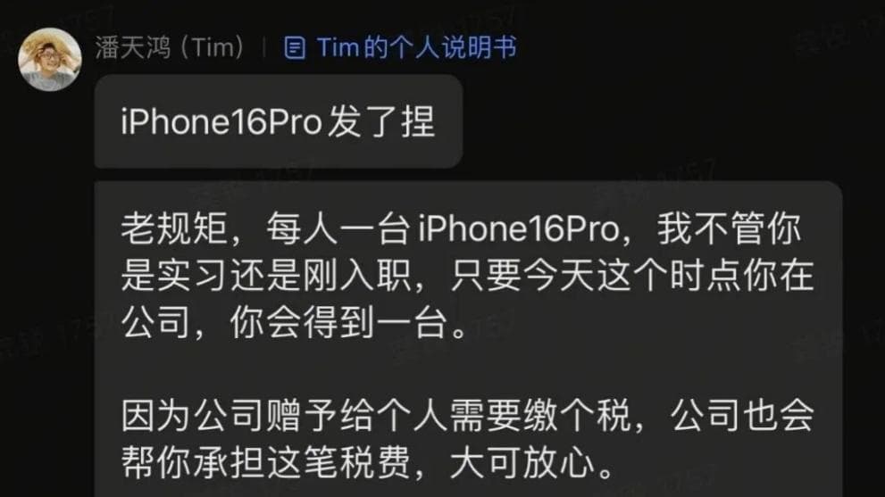 而作为老板,潘天鸿十分壕气,在苹果的“科技春晚”后,宣布为公司所有员工赠送iPhone 16 Pro,并且承担员工获赠产品的个税。