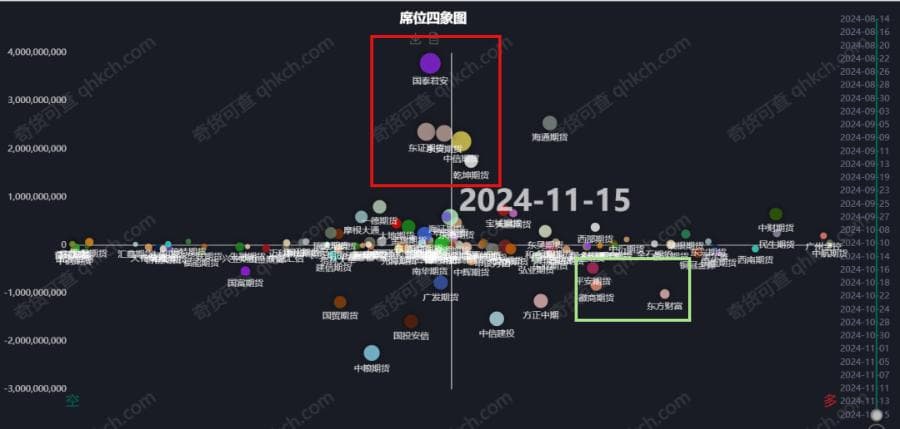 下图的横坐标是近三个月的各大席位所有品种净持仓的多空趋势,越往左,越偏空头,越往右,越偏多头,纵坐标是近三个月的盈亏水平,越往上盈利水平越高,越往下亏损程度越高。