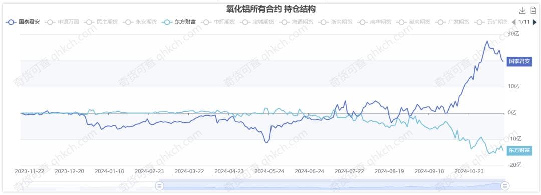 氧化铝上半年的行情,国泰君安席位是主力空头之一,亏损严重却坚持空头,终于在7月的一波宏观面引发的集体调整中减亏,并成功在7月中旬的底部区域空翻多,也标志着其投资策略发生重大变化,在下半年的主升浪行情中保持略多头的净仓位,在10月至今最疯狂的一段上涨行情中,上升为第一大多头席位,扭亏为盈,成为这个品种今年的第二大盈利席位。