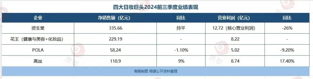 根据公开财报,今年前三季度,四大头部日妆集团——资生堂、花王、POLA、高丝合计总销售额达1057.47亿元。值得一提的是,这也是上述企业自2023年录得同比下滑后,重回增长。