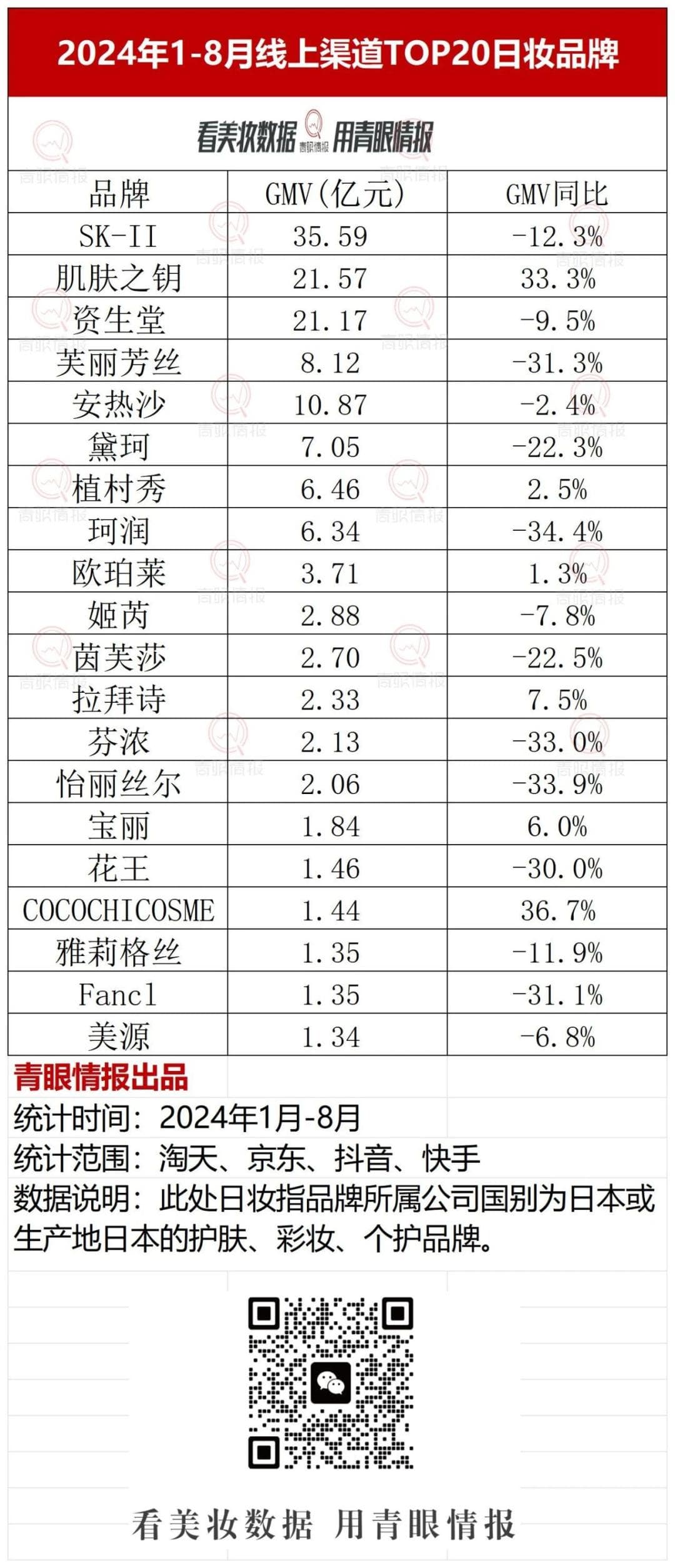 据青眼情报数据,今年1-8月线上渠道日妆总GMV同比增长22.18%,但GMV TOP20的日妆头部品牌中,70%的品牌GMV同比下滑,其中芙丽芳丝、珂润、芬浓、怡丽丝尔、花王、Fancl跌幅超30%。