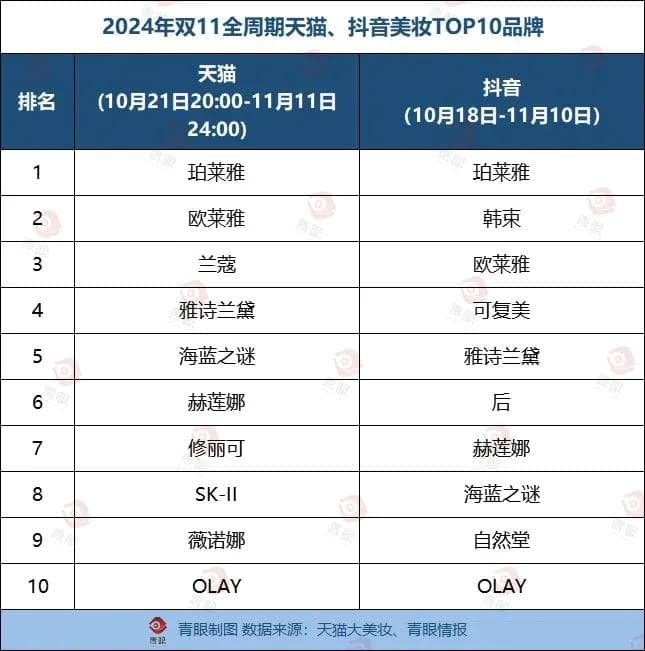 而从刚刚过去的“双11”大促节点来看,在全周期天猫美妆品牌TOP10榜单中,上榜的日系品牌仅有SK-II;抖音“双11”美妆榜单TOP10中,仅有SK-II在抖音“双11”抢先期上榜,随后的全周期结束,甚至没有日妆品牌的身影。