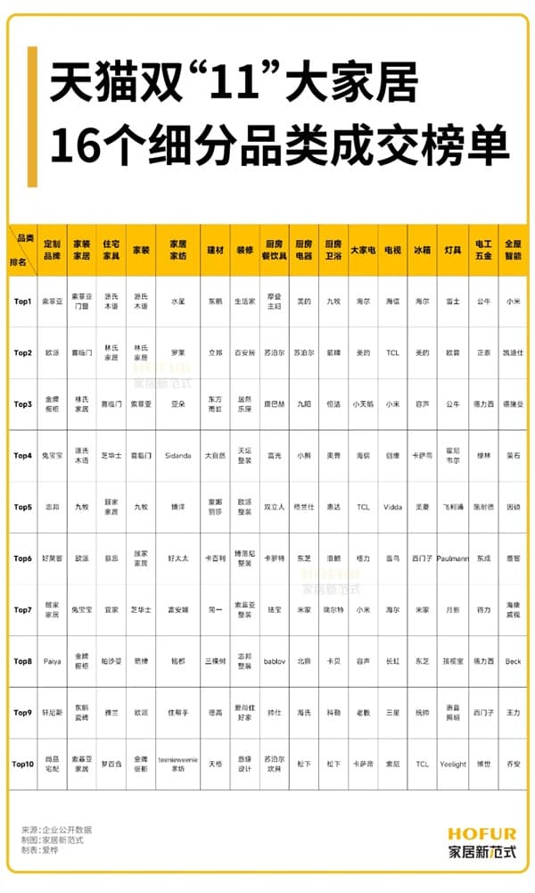 在梳理过程,家居新范式发现,今年天猫双“十一”围绕家居建材板块的16个细分品类Top前十,多为头部品牌,有些还是淘系品牌。