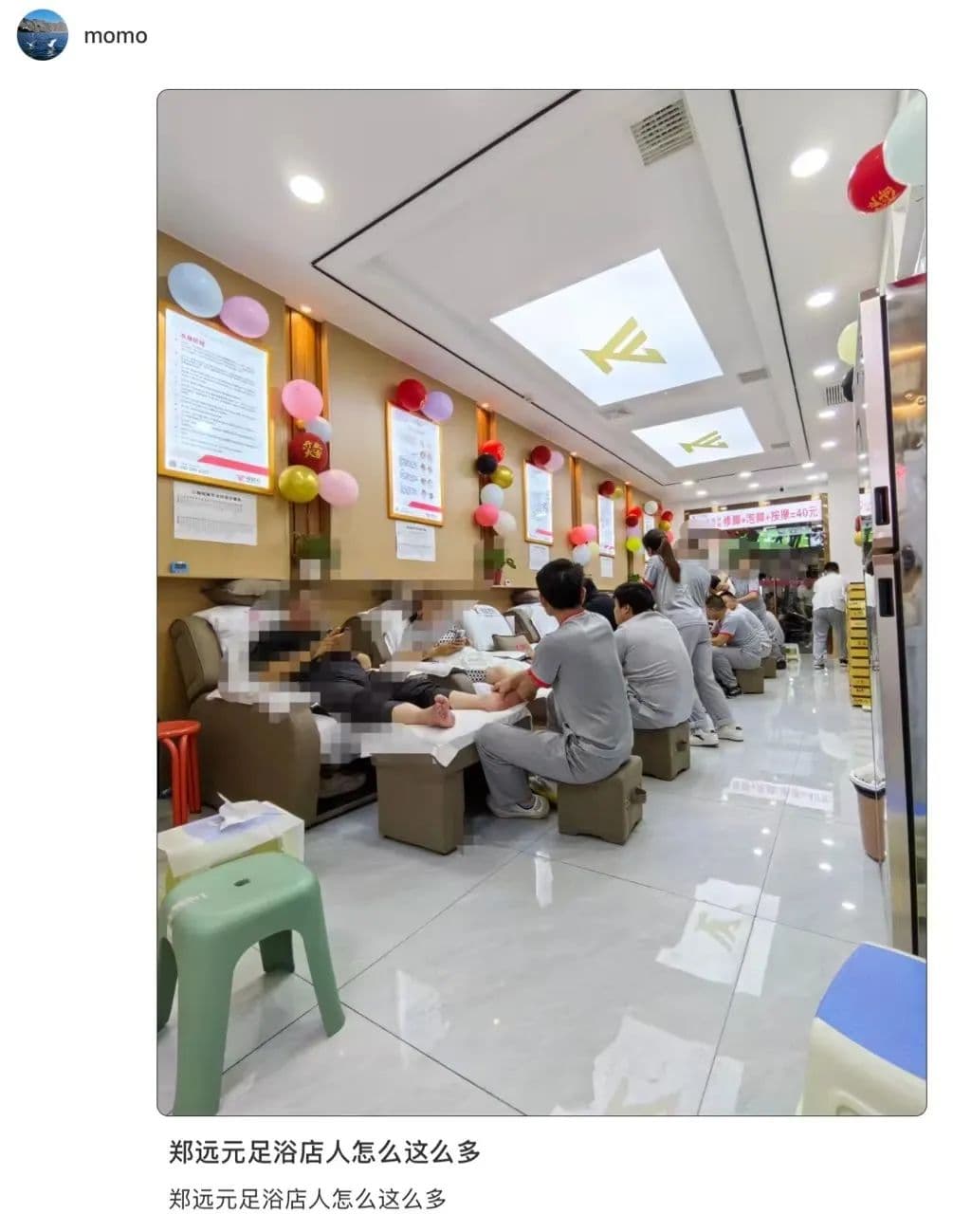 修脚店最初能够吸引年轻人的一个原因是足够便宜。位于城市中心商业发达的地段,比起一次消费就要过百元的足疗水会来说,像郑远元、彭世、朋朋这类平价连锁修脚店能让打工人轻松实现“修脚自由”,40分钟的足疗能低至39.9元,其中包含了泡脚、修脚、肩颈按摩、足底按摩,堪称按摩界的综合平替,除了不定期推出的套餐,其他项目正常做也不过大几十元,花上百元就能享受大桶泡的“豪华套餐”了。