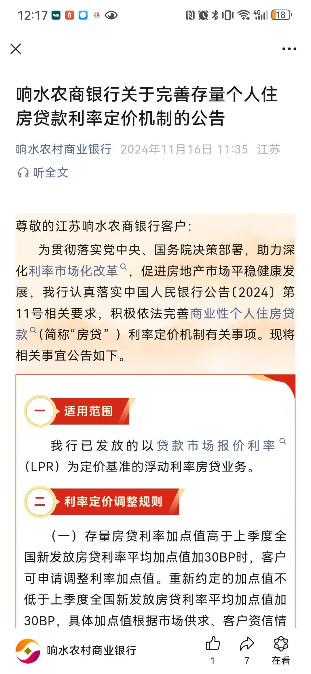11月16日,珠江村镇银行在官方微信公众号发文称,为贯彻党中央、国务院决策部署,助力深化利率市场化改革,促进房地产市场平稳健康发展,珠江村镇银行认真落实中国人民银行《关于完善商业性住房贷款利率定价机制的公告》相关要求, 积极依法完善商业性个人住房贷款利率定价机制有关事项,现对外进行公告。