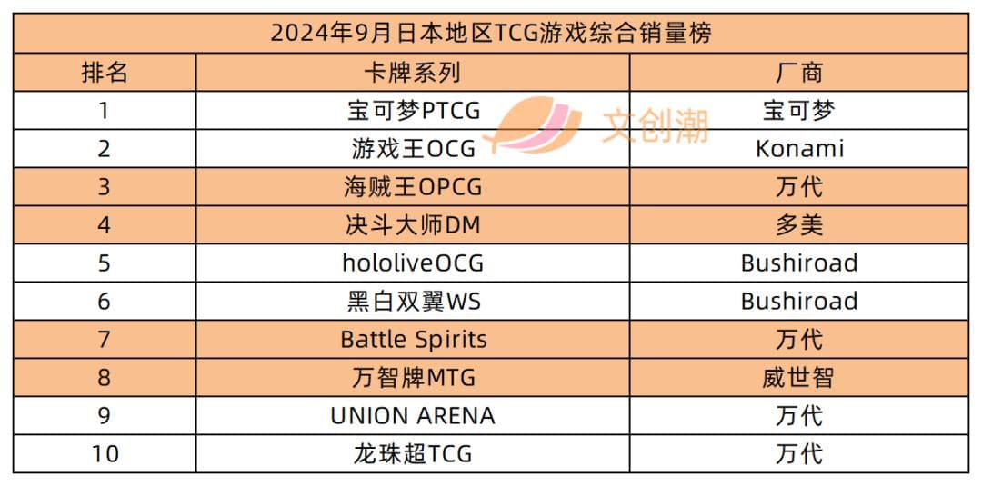 近日,日本连锁卡店Cardbox公开的日本地区2024年9月TCG游戏(未含中古品)综合销量榜,如图所示。