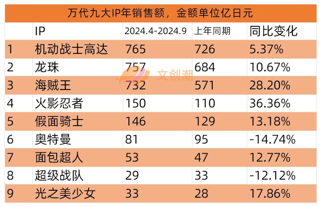 2024年2-3季度(2024.4.1-9.30),万代的九大IP中,有7个实现收入增长。