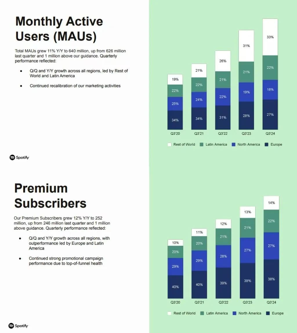 据悉,从2020年第三季度到2024年第三季度,新兴市场在Spotify全球月活跃用户中的占比从19%升至33%,取代北美(从25%降至18%)成为最大贡献区域。同时,欧洲在订阅用户中的主导地位有所削弱(占比从40%降至38%),而拉丁美洲和新兴市场则稳步增长,分别达22%和14%。