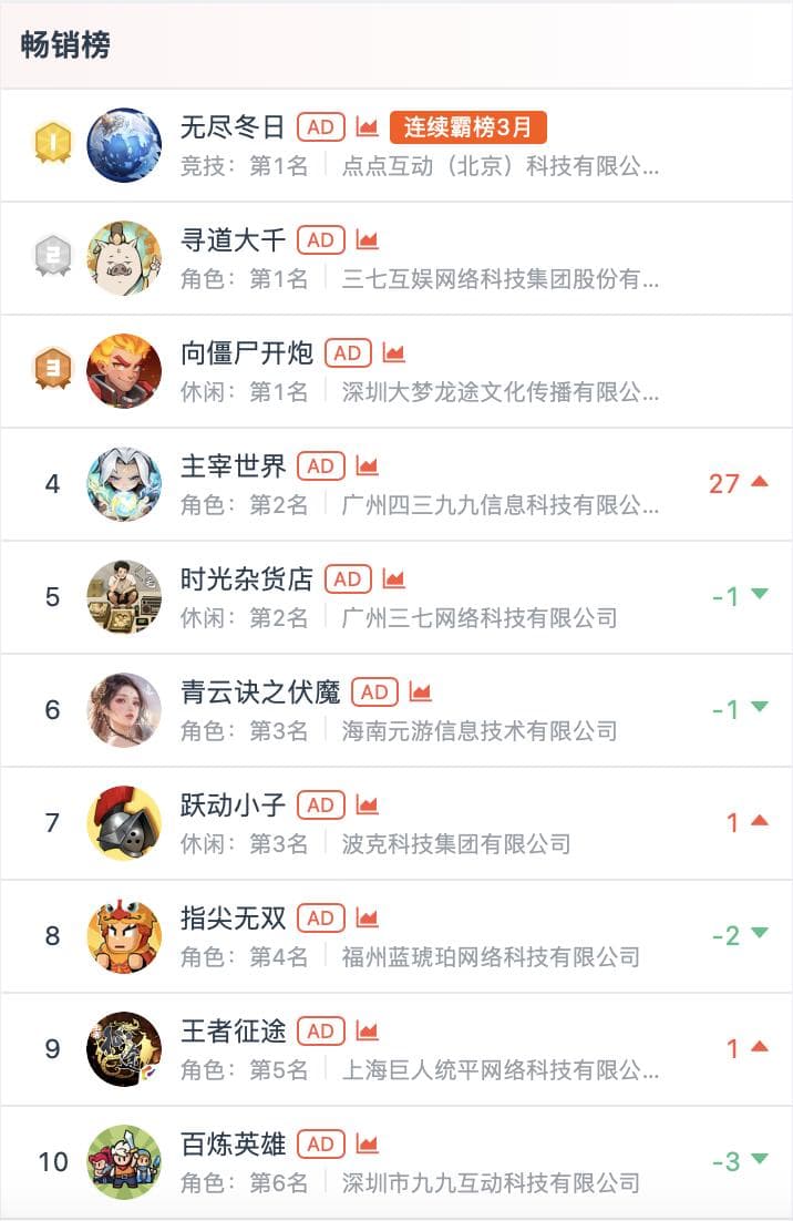 畅销前十中,点点互动的《无尽冬日》不负众望,最为显眼,稳稳待在第一的位置,已持续三个月之久。