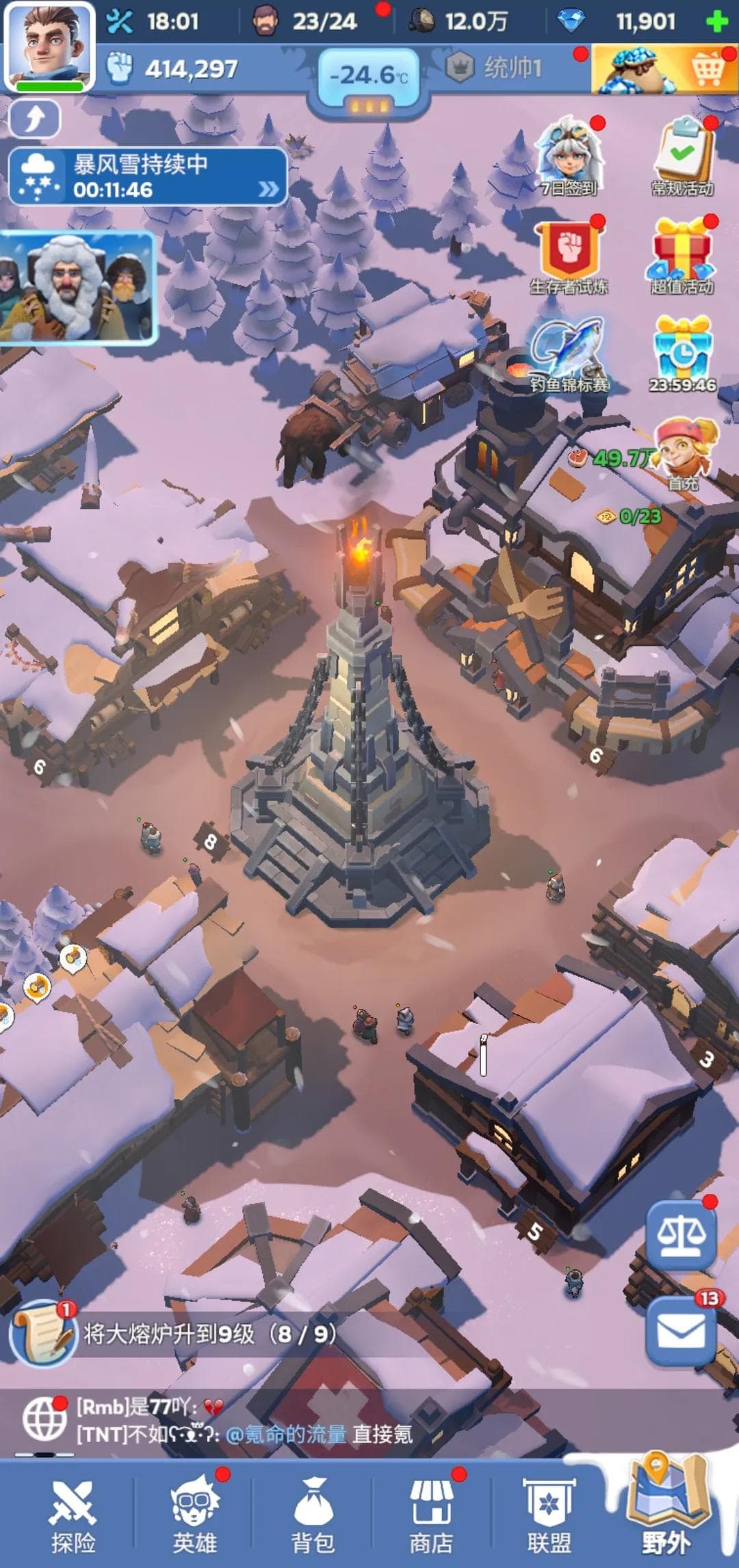 游戏在今年4月推出小程序版本,虽然它的玩法隶属于中重度的SLG品类,但在游玩初期,玩家几乎感觉不到传统SLG带来的资源及战斗压力,而是在冰天雪地里反复搜集资源,升级民居、大熔炉,慢慢建立起自己的据点。