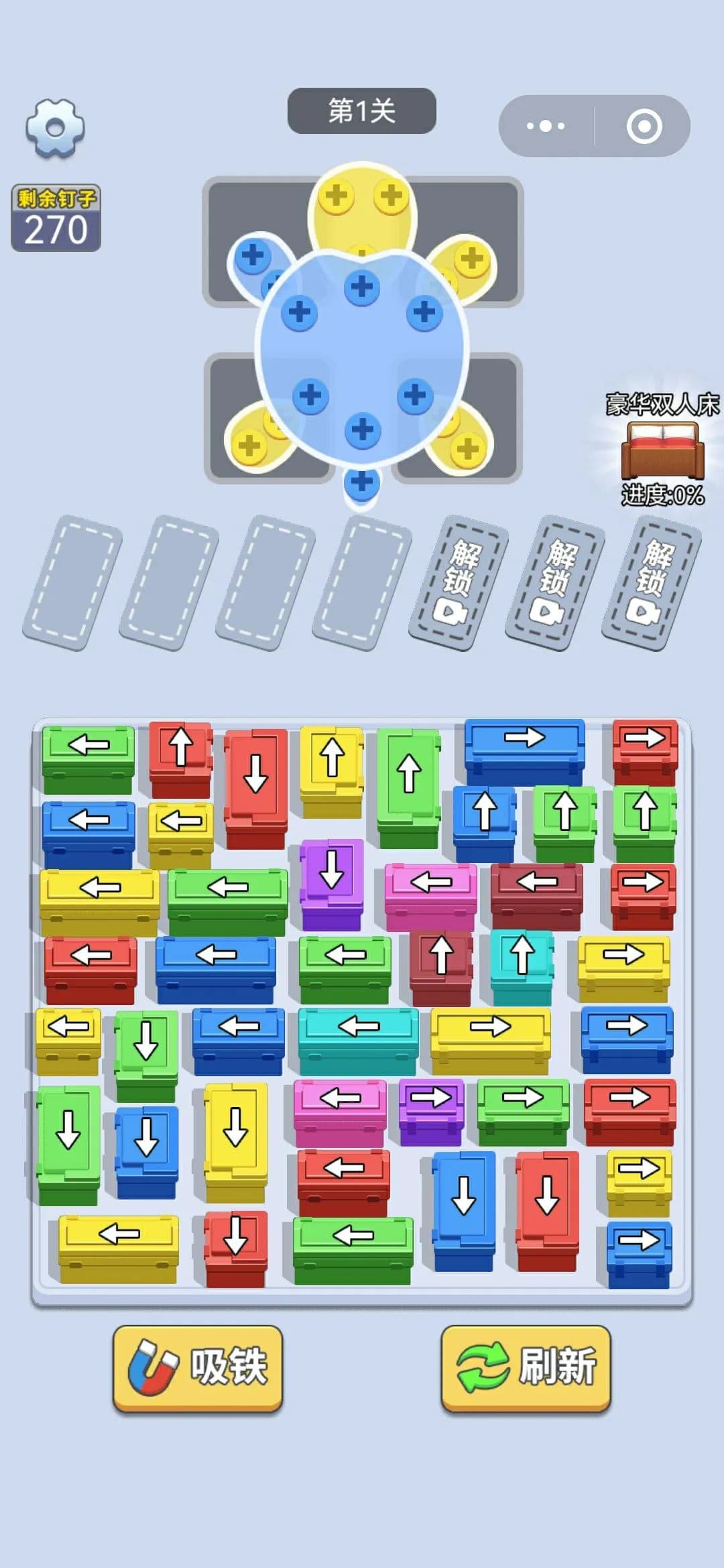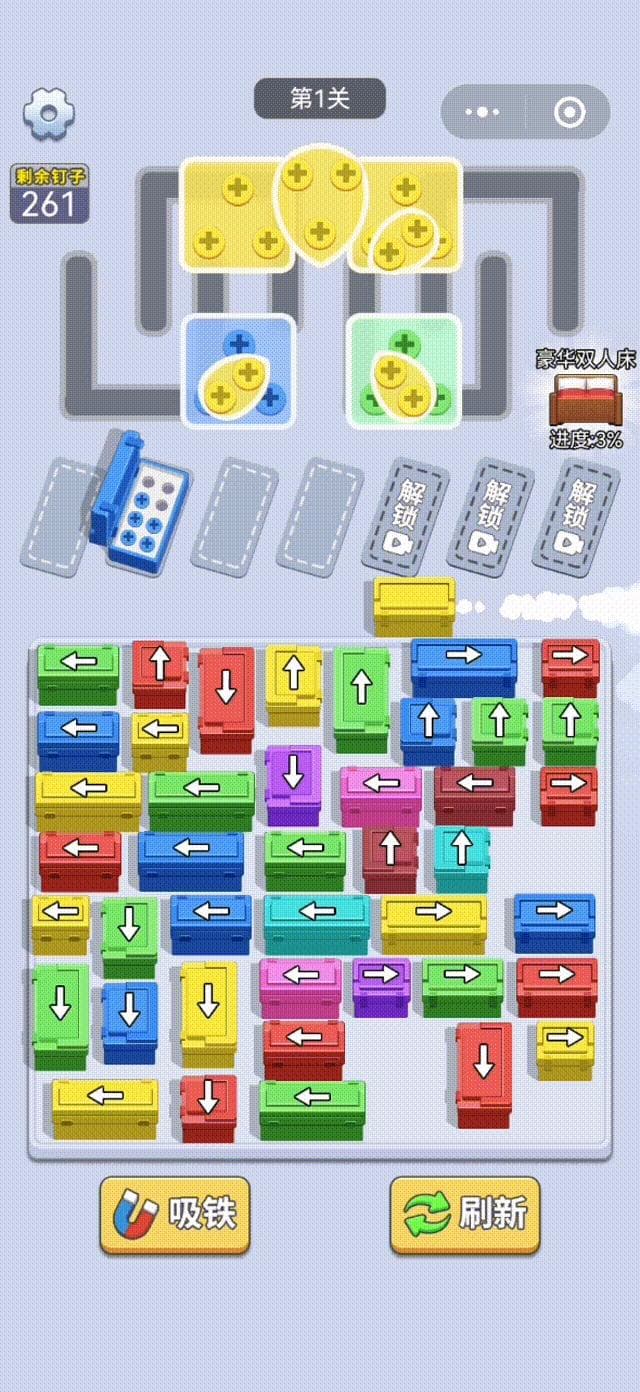 益智小游戏《闯关大聪明》首次进入月榜就空降畅玩榜第5,结合了打螺丝和箭头停车玩法。游戏上方会生成镶有各种颜色螺丝的板材,下方则是停靠的众多盒子,玩家需要根据最上面一层螺丝的颜色和数量,选择合适的盒子,让螺丝顺利落入盒中,再一层层拆开板材,直至通关。