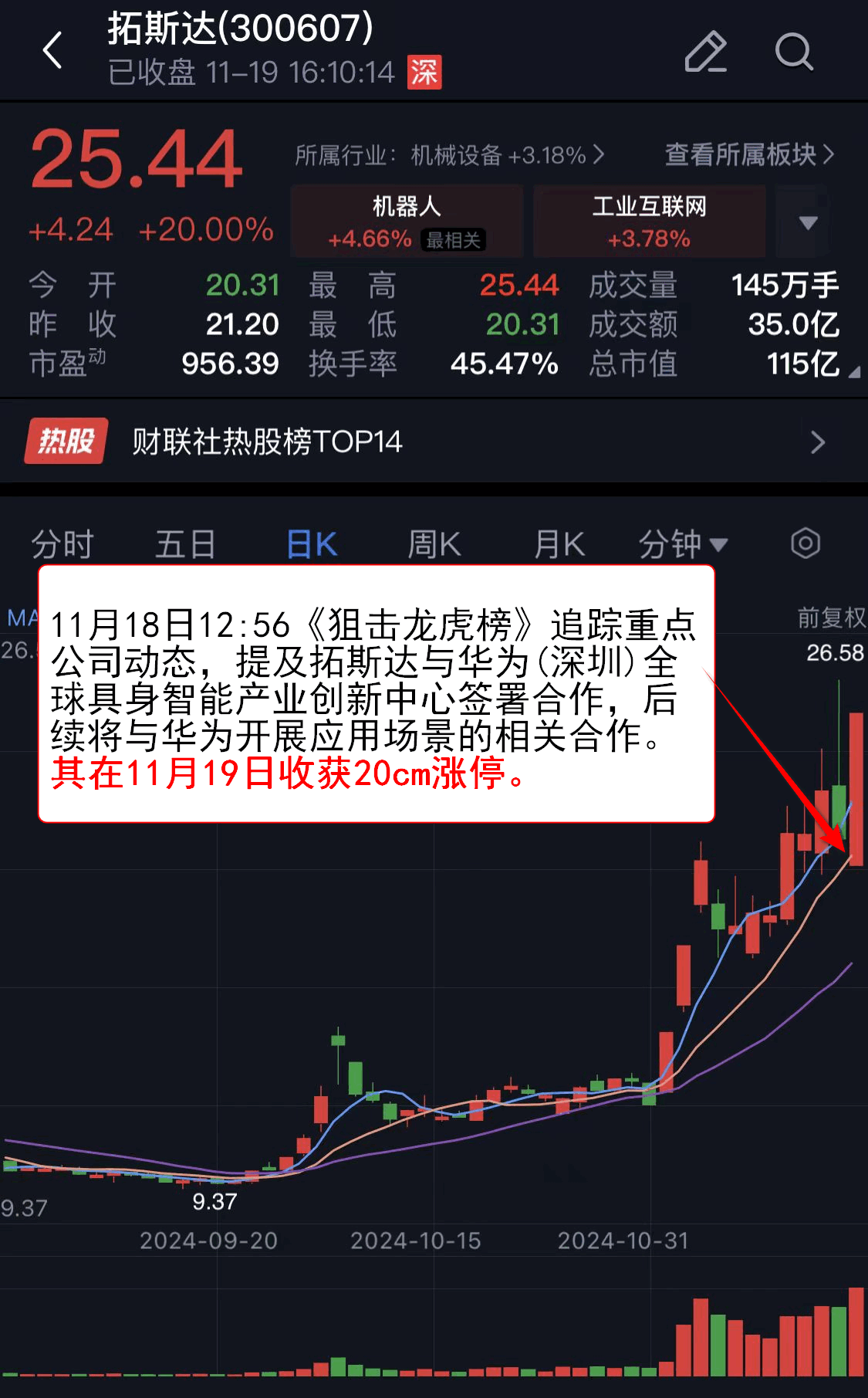 ,提及拓斯达与华为(深圳)全球具身智能产业创新中心签署合作,后续将与华为开展应用场景的相关合作。其在11月19日收获20cm涨停。
