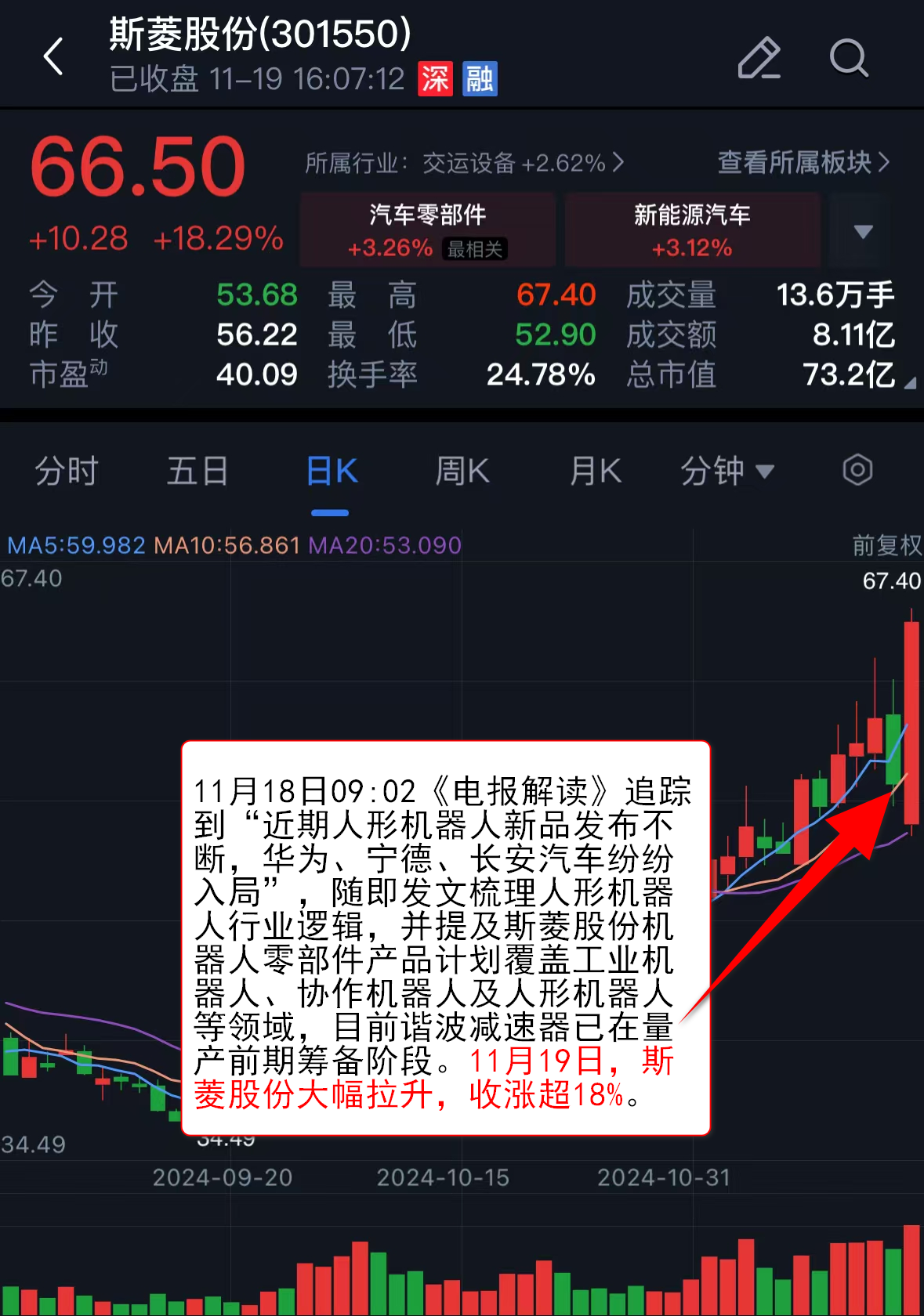 ,华为、宁德、长安汽车纷纷入局”,随即发文梳理人形机器人行业逻辑,并提及斯菱股份机器人零部件产品计划覆盖工业机器人、协作机器人及人形机器人等领域,目前谐波减速器已在量产前期筹备阶段。11月19日,斯菱股份大幅拉升,2个交易日最高涨11.22%。