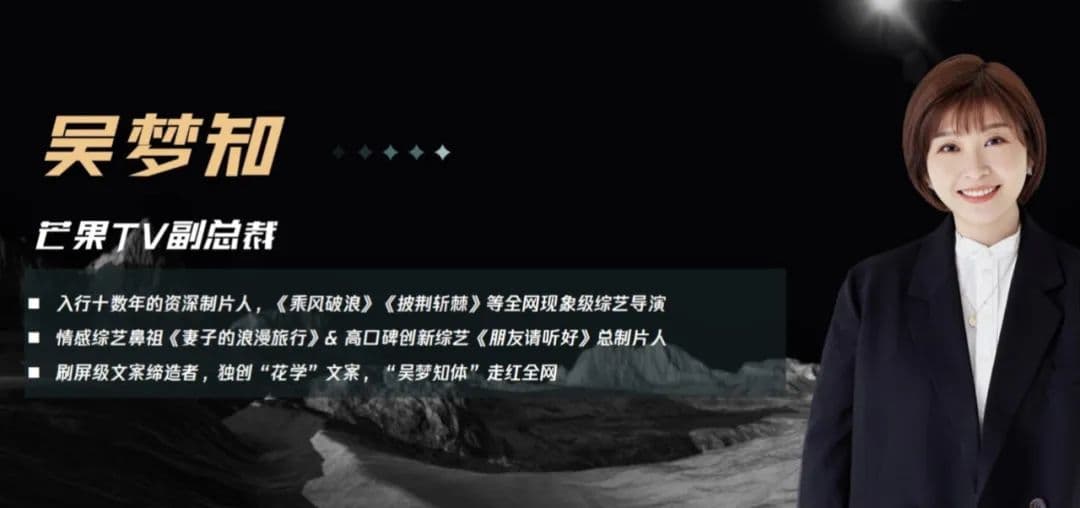 在芒果摸爬滚打多年,从加入龙丹妮团队到独立制作多档爆综,吴梦知对国综界的贡献有目共睹。早年她在舆论场的关键词是“文案女王”、“浪姐之母”,前者指她独树一帜的文案功底奠基了芒果综艺引领行业的文案风格,后者说的是她凭着一套原创节目研发逻辑一手打造了《浪姐》。