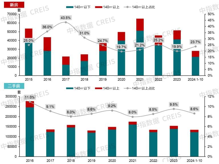 从成交结构来看,新房方面,多年来140m²以上户型占新房成交规模的20%以上,2024年1-10月,140m²以上户型成交占比为23.7%,较2023年提升3.8个百分点;二手房方面,140m²以上户型占比常年低于10%,2024年1-10月占比仅为8.6%。