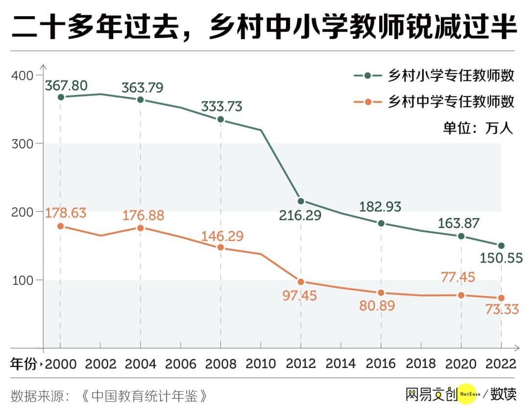 早在改革开放后,乡村教师就开始跟着乡村学校一同“退场”,从 1978 年到 2000 年,乡村中小学的专任教师缩减了 143.03 万人 [1][8]。