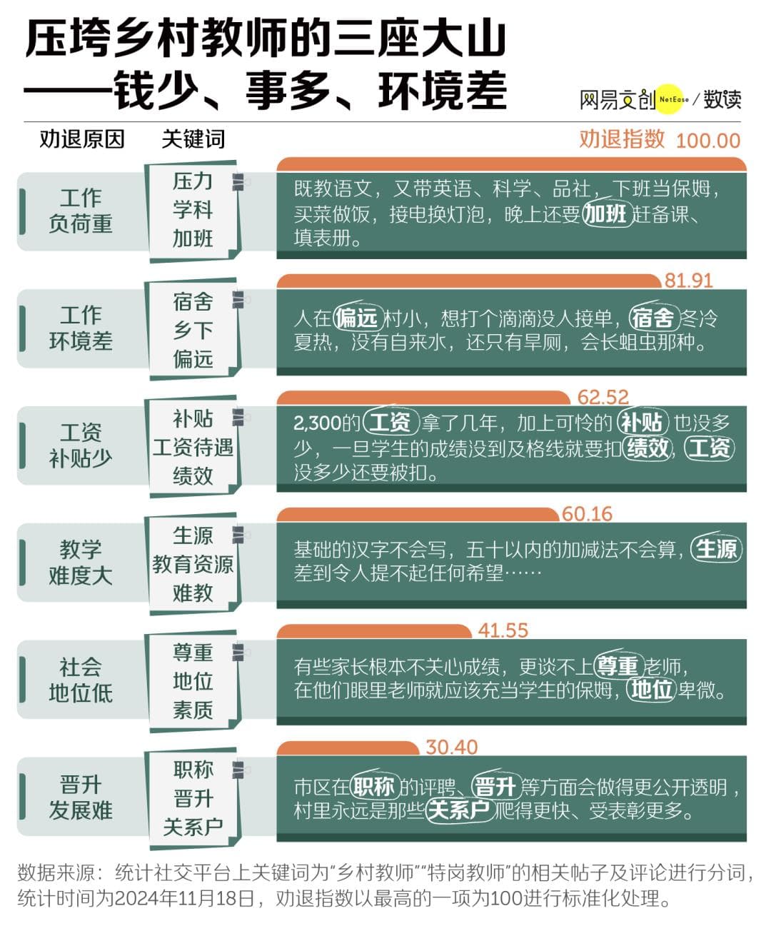 我们统计社交平台上的相关讨论后发现,光是乡村教师的三大原罪——压力大、环境差、工资低,就把很多人劝退到了离职的边缘。