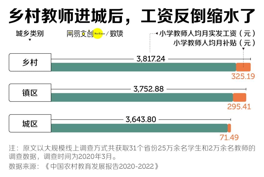 以小学阶段为例,城镇教师的人均月实发工资总体上都低于乡村,城区教师的月补贴甚至不到乡村的四分之一。