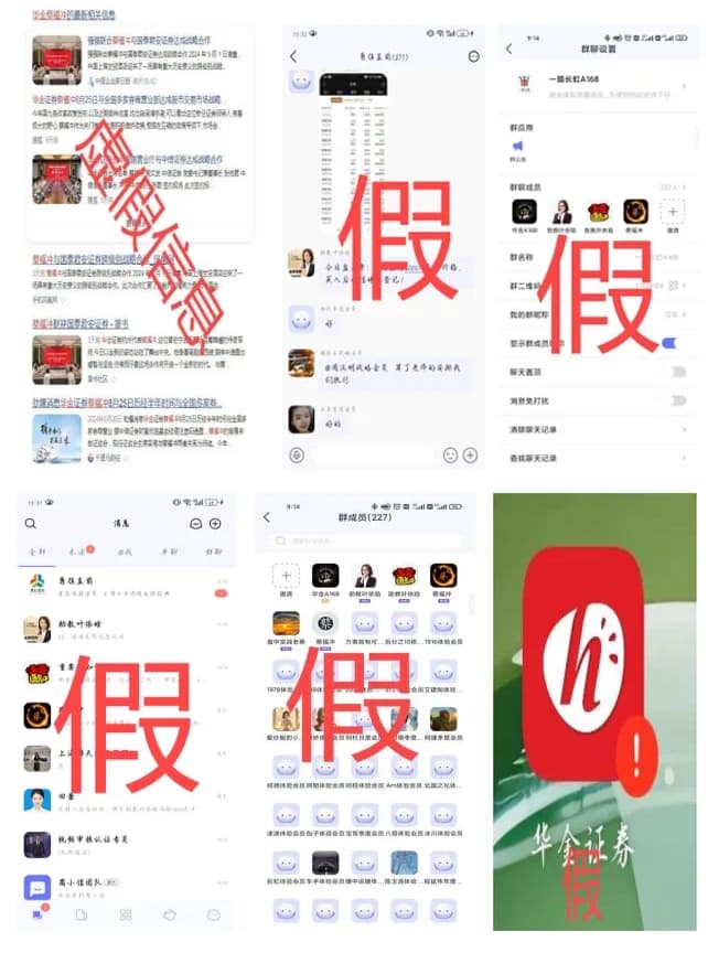 华金证券发现不法分子假冒公司或工作人员实施诈骗活动,通过编造虚假信息、在短视频平台推荐股票直播等方式,引导投资者下载 “商小信 APP” 加入群聊,假冒公司名义和工作人员发送荐股资讯,伪造合同与印章,诱骗投资者加入收费会员服务。
