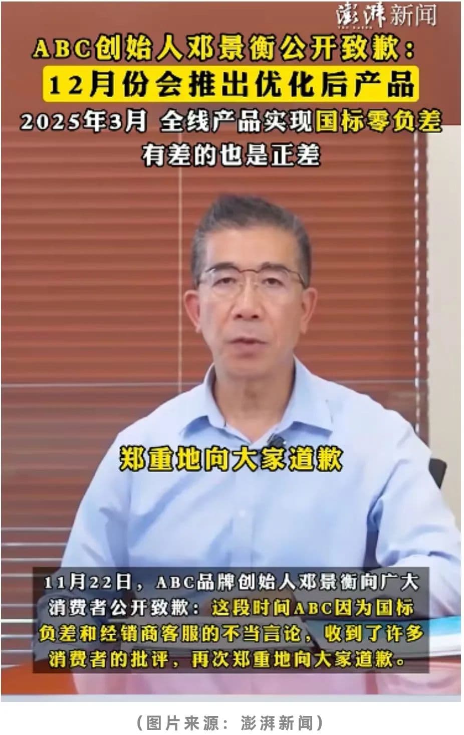 11月22日,ABC品牌创始人邓景衡发布了向消费者鞠躬道歉的视频,表示将在2025年3月实现全线产品“国标零负差”。创始人亲自下场道歉,展现了品牌对此事的重视程度,整个卫生巾行业可能会因此迎来转折点。但从网友的反应来看,大多数人仍持观望态度,表示接受道歉,但强调品牌应该用真正的好产品来为自己正名。